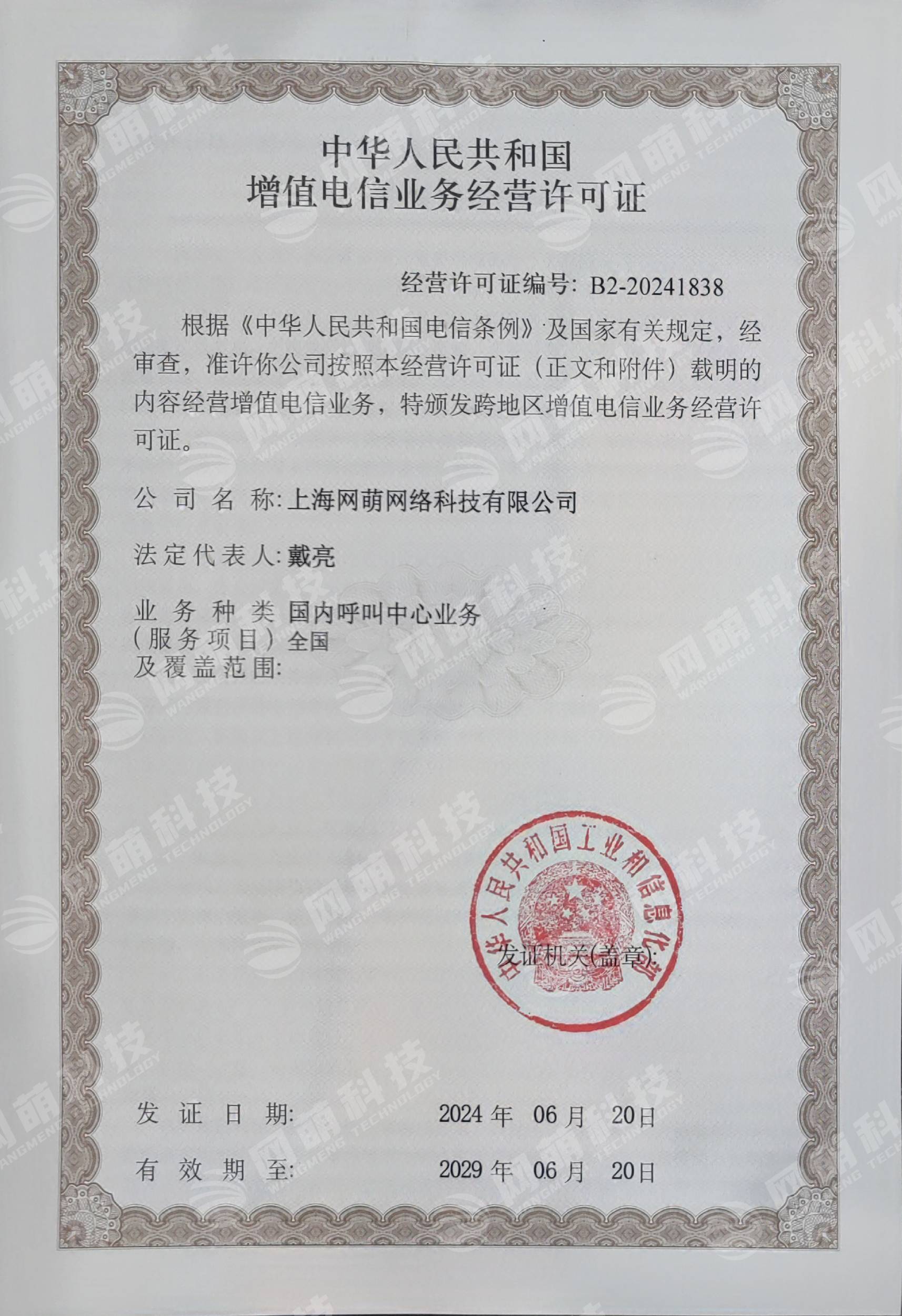 2024年6月20日,上海網(wǎng)萌網(wǎng)絡(luò)科技有限公司(以下簡(jiǎn)稱"網(wǎng)萌科技")榮獲中華人民共和國(guó)工業(yè)和信息化部頒發(fā)的《中華人民共和國(guó)增值電信業(yè)務(wù)經(jīng)營(yíng)許可證》,經(jīng)營(yíng)許可證編號(hào):B2-20241838。這標(biāo)志著網(wǎng)萌科技在提升企業(yè)業(yè)務(wù)水平、提高服務(wù)質(zhì)量、增強(qiáng)市場(chǎng)競(jìng)爭(zhēng)力的道路上再次邁上了一個(gè)新的臺(tái)階,同時(shí)也奠定了公司在國(guó)內(nèi)電信業(yè)務(wù)運(yùn)營(yíng)方面的重要地位。